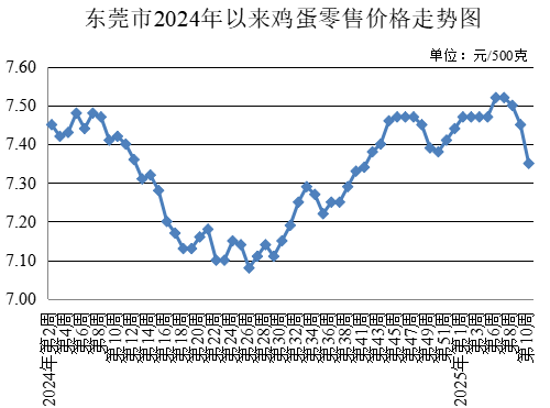 第10周,所監測的雞蛋農貿市場零售均價為每500克7.35元,較上周下降1.34%。