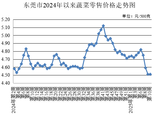 第10周,所監測的30種蔬菜農貿市場零售均價為每500克4.51元,與上周持平。其中,13種葉菜類農貿市場零售均價為每500克4.54元,較上周上升0.67%。17種非葉菜類農貿市場零售均價為每500克4.49元,較上周下降0.44%。